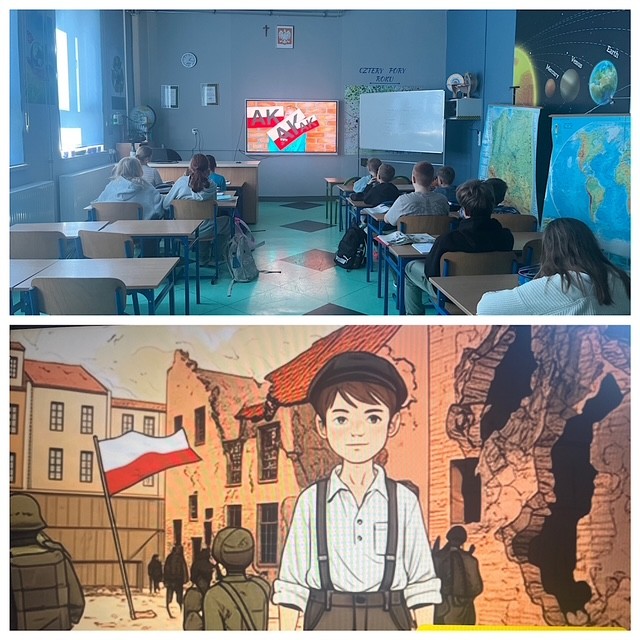 Podczas lekcji historii rozmawiamy o powstaniu warszawskim, oglądamy filmy, tworzymy plakaty oraz kartki z podziękowaniami dla powstańców.