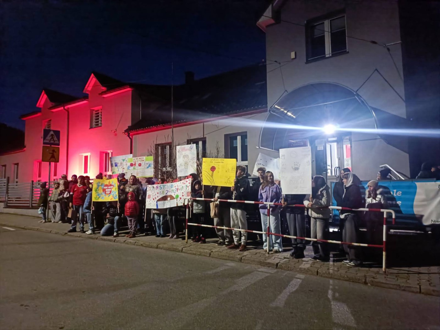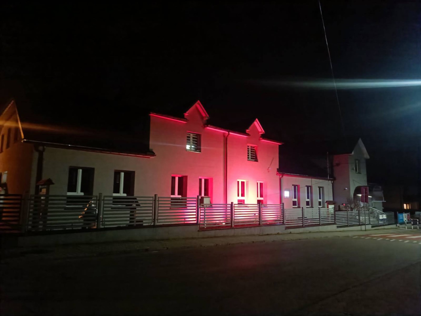 Podświetlenie szkoły na czerwono jako wyraz solidarności z ogólnopolską kampanią oraz podkreślenie wagi ochrony praw dziecka.