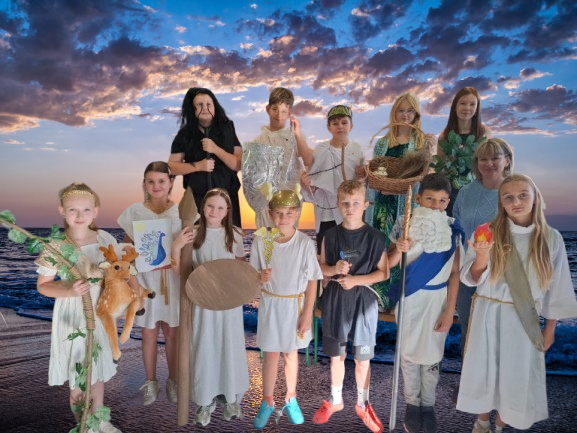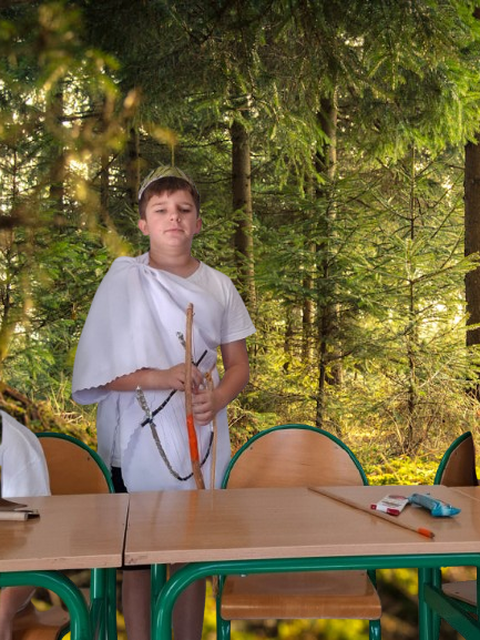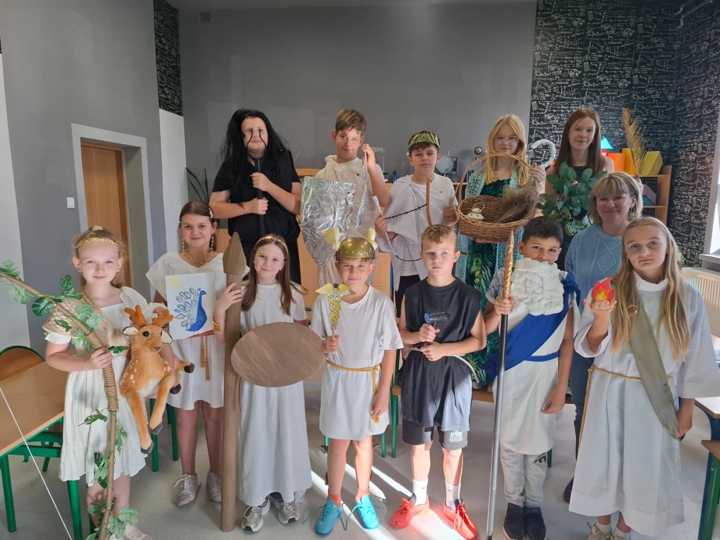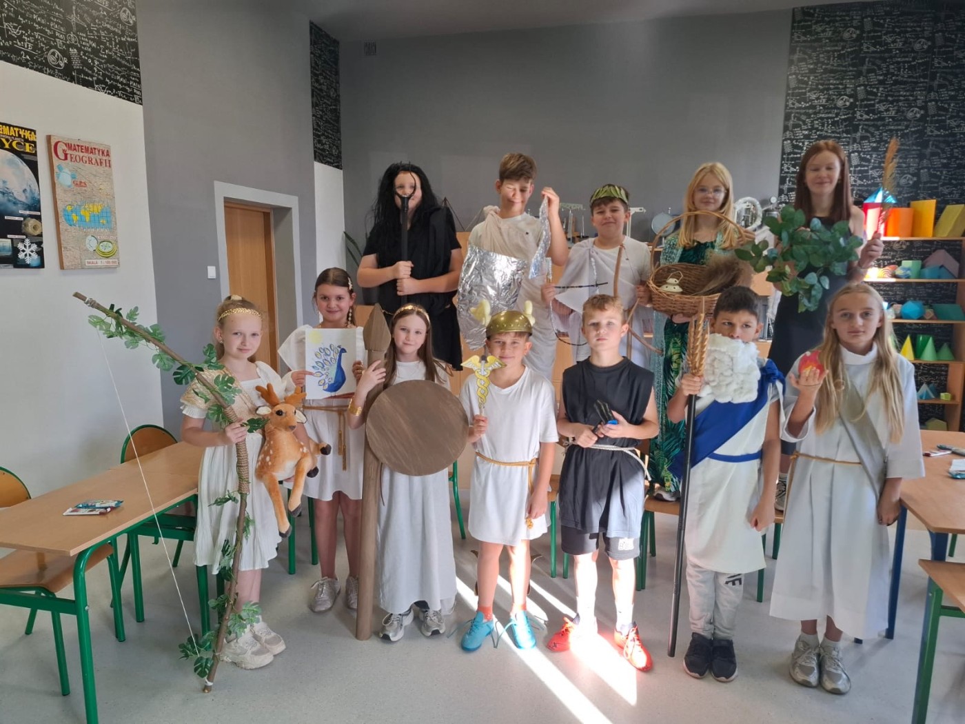 W tym tygodniu uczniowie klasy 5 przenieśli się w czasie do starożytnej Grecji! Podczas wyjątkowej lekcji historii wcielili się w role greckich bogów i bogiń z mitologii olimpijskiej. Każdy z uczniów przygotował strój oraz rekwizyty charakterystyczne dla swojego bohatera – można było zobaczyć m.in. Zeusa z błyskawicą, Apollina z lirą, Posejdona z trójzębem czy Demeter z darami ziemi.