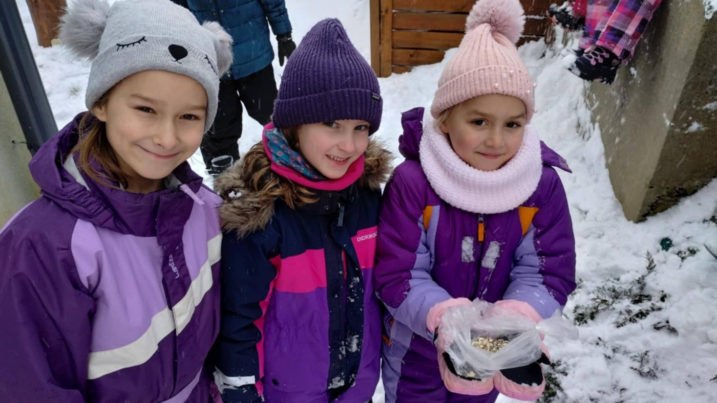 Klasa I na zajęciach w terenie-dokarmiamy ptaki i robimy eksperymenty z lodem.