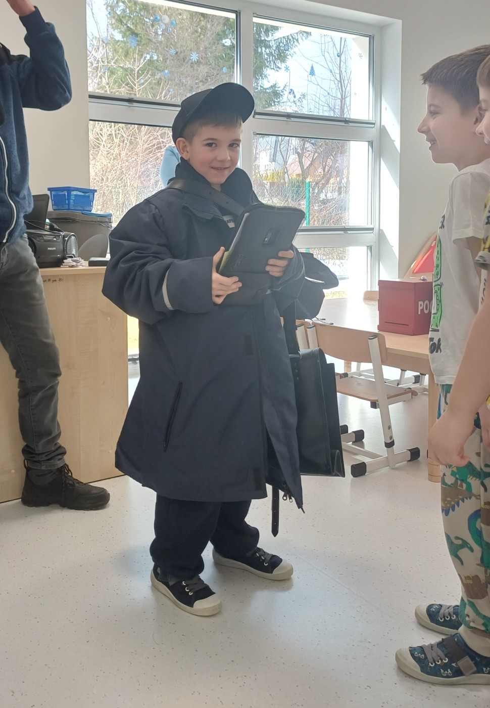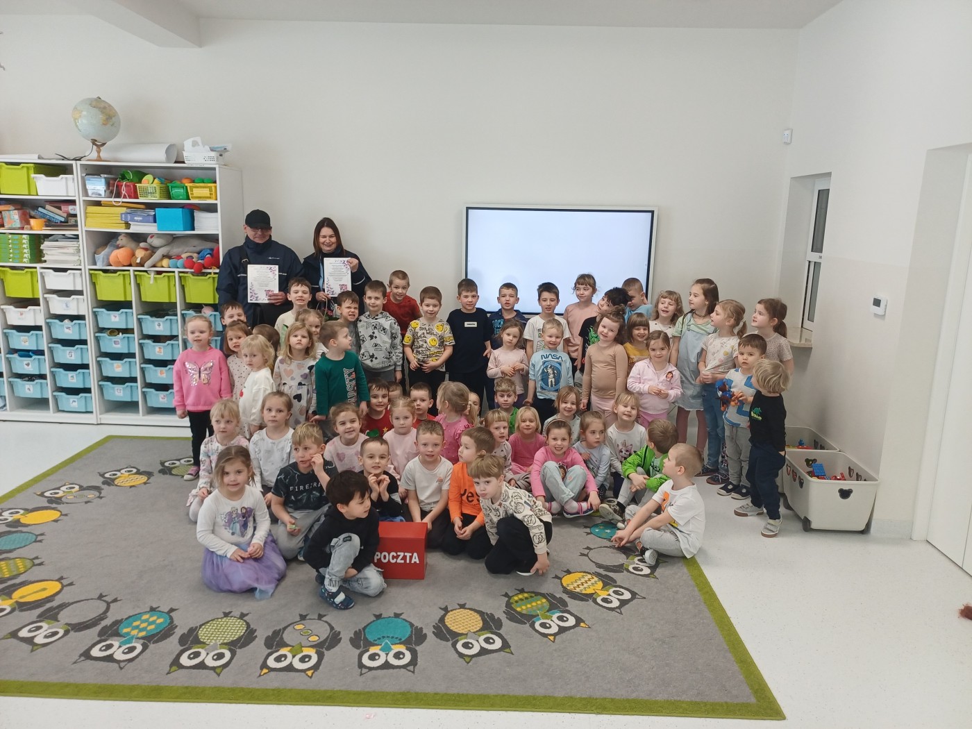 Spotkanie rozpoczęło się od przybliżenia dzieciom tajników pracy na poczcie. Pani Agnieszka opowiedziała o odpowiedzialnej roli naczelnika oraz o tym, jak wygląda droga listu od momentu wrzucenia go do skrzynki aż do doręczenia.