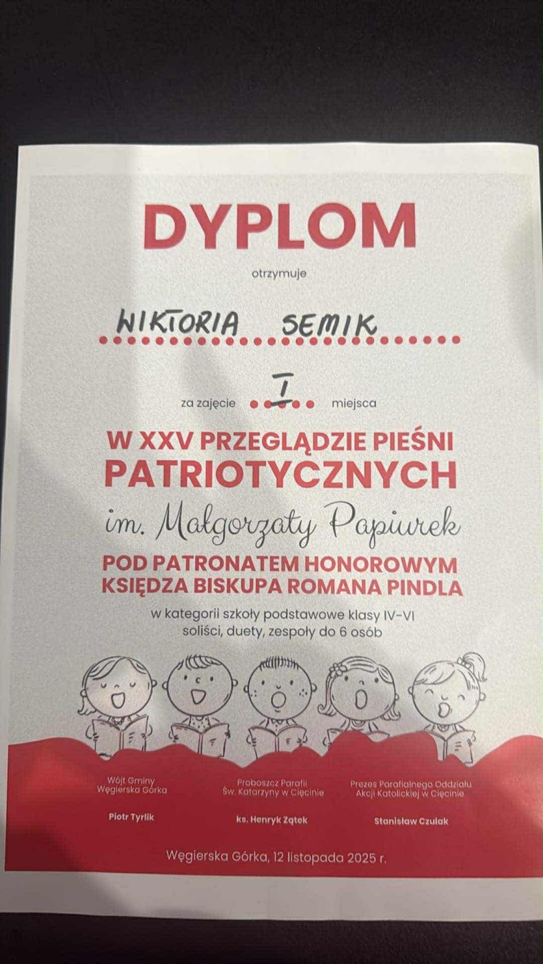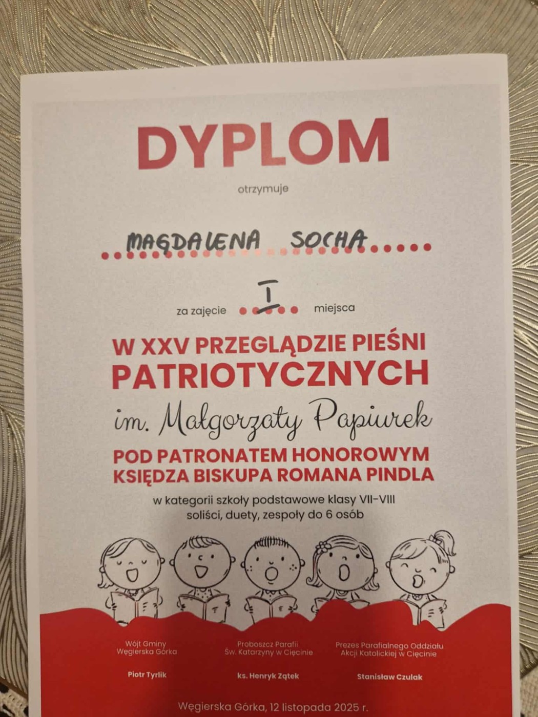 Z ogromną radością informujemy, że uczennice naszej szkoły – Magdalena Socha i Wiktoria Semik – zdobyły pierwsze miejsca w jubileuszowym XXV Przeglądzie Pieśni Patriotycznej im. Małgorzaty Papiurek, organizowanym przez Akcję Katolicką.✨