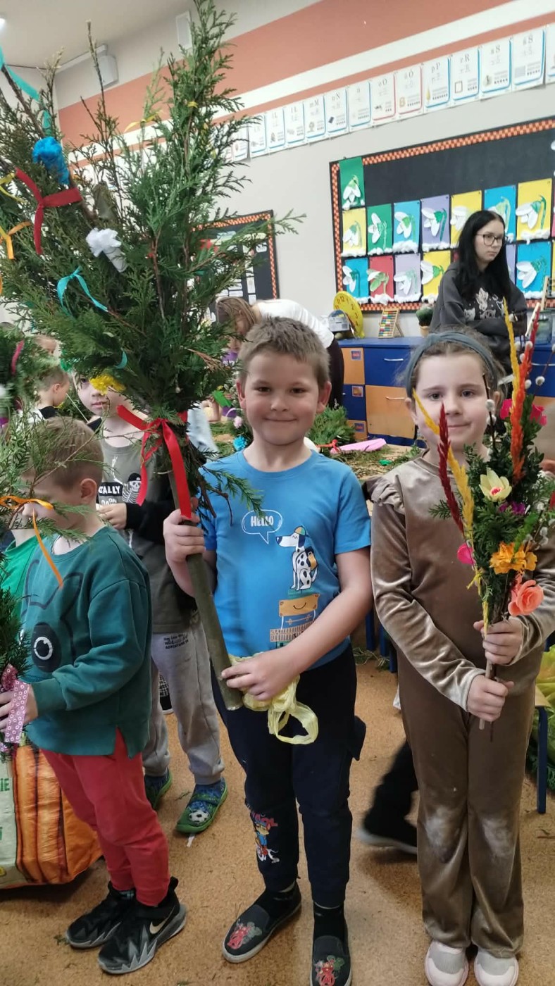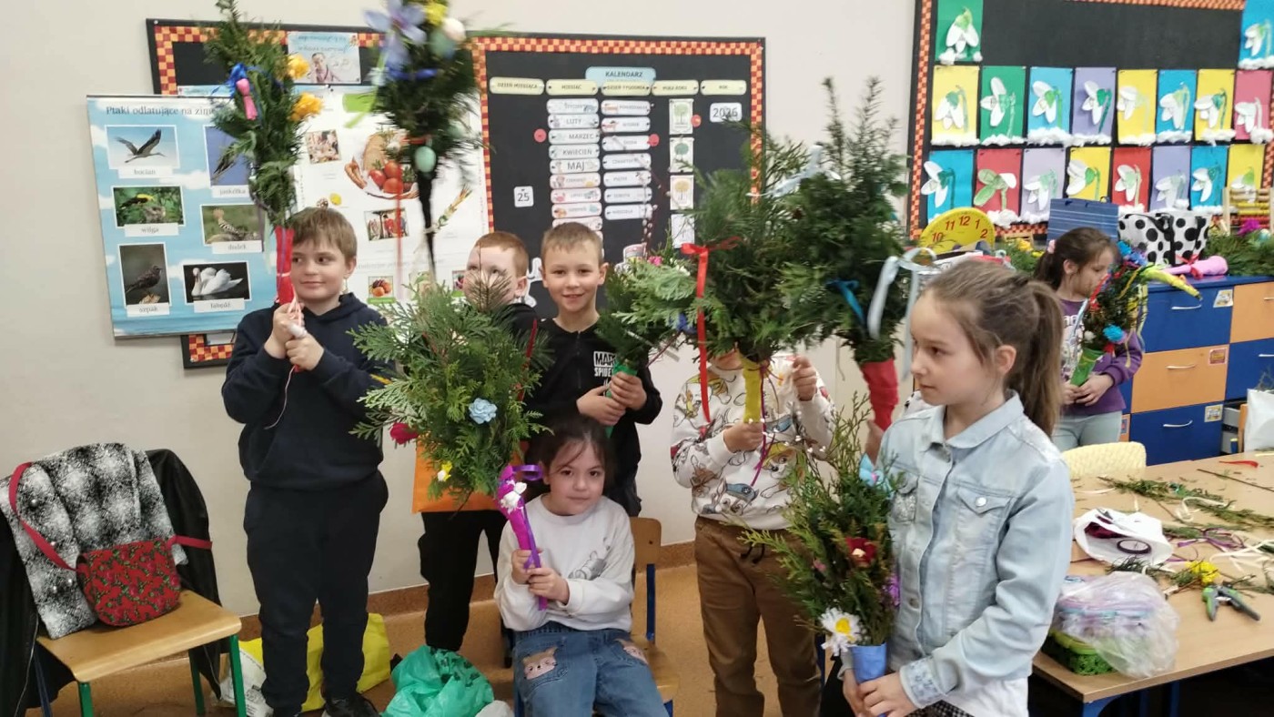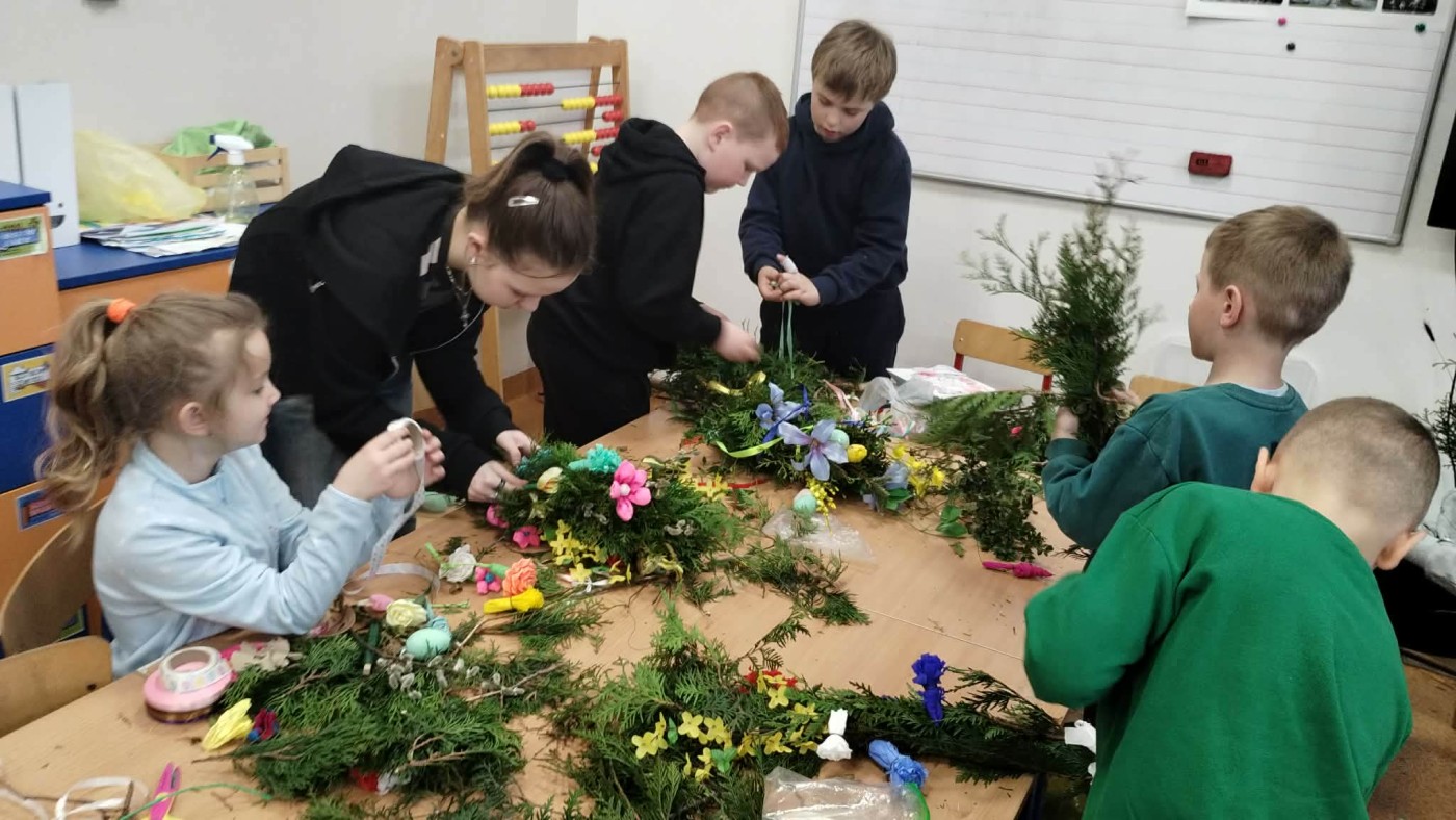 26 marca w klasie I i II z okazji nadchodzących Świąt Wielkanocnych zorganizowano warsztaty wyrobu palm wielkanocnych. Celem zajęć było przybliżenie tradycji Świąt Wielkanocnych, doskonalenie umiejętności współpracy, rozwijanie poczucia estetyzmu i rozbudzanie wyobraźni. Poprowadziły je dla nas Panie z Koła Gospodyń Wiejskich, na które zawsze możemy liczyć, wspomagane uczniami ze Szkolnego Koła Wolontariatu. Podczas warsztatów każde dziecko wykonało tradycyjną palmę wielkanocną z bukszpanu, trzciny, gałązek oraz suszonych kwiatów. Na zajęciach panowała miła, radosna atmosfera. Wykonane na zajęciach palmy uczniowie zabrali ze sobą do poświęcenia w Niedzielę Palmową.