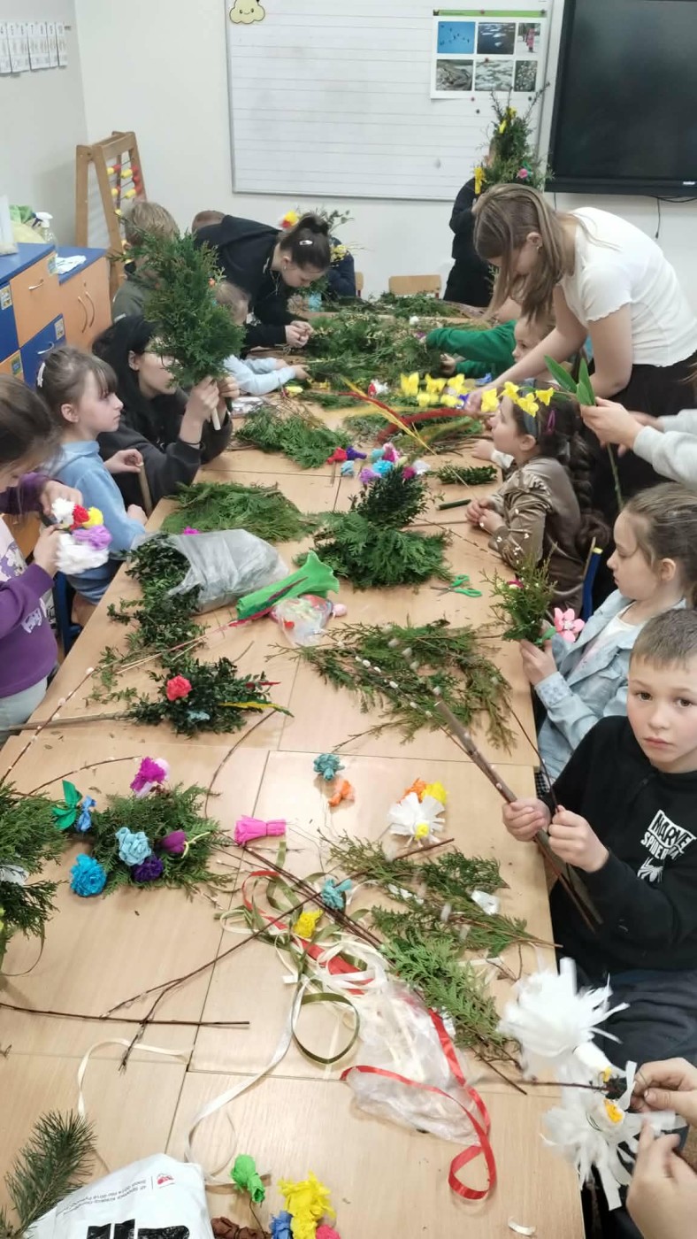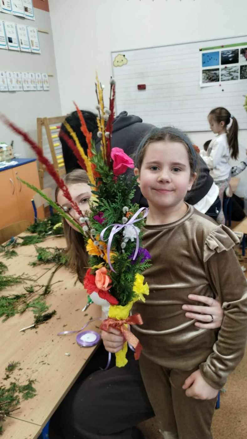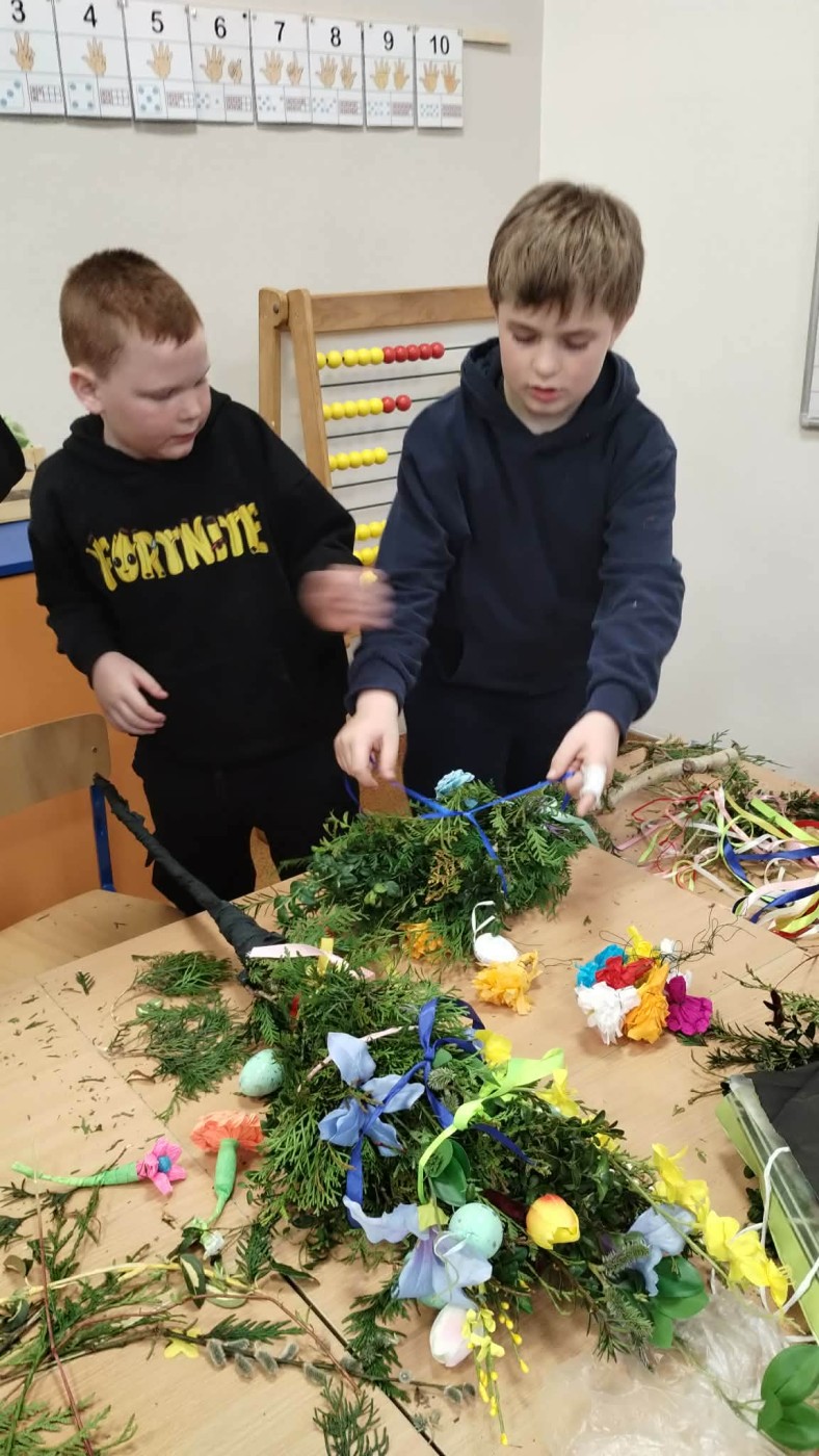 26 marca w klasie I i II z okazji nadchodzących Świąt Wielkanocnych zorganizowano warsztaty wyrobu palm wielkanocnych. Celem zajęć było przybliżenie tradycji Świąt Wielkanocnych, doskonalenie umiejętności współpracy, rozwijanie poczucia estetyzmu i rozbudzanie wyobraźni. Poprowadziły je dla nas Panie z Koła Gospodyń Wiejskich, na które zawsze możemy liczyć, wspomagane uczniami ze Szkolnego Koła Wolontariatu. Podczas warsztatów każde dziecko wykonało tradycyjną palmę wielkanocną z bukszpanu, trzciny, gałązek oraz suszonych kwiatów. Na zajęciach panowała miła, radosna atmosfera. Wykonane na zajęciach palmy uczniowie zabrali ze sobą do poświęcenia w Niedzielę Palmową.
