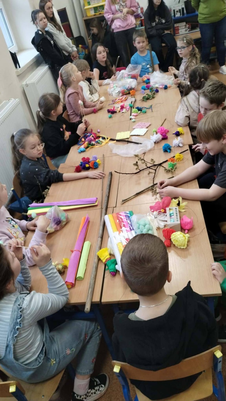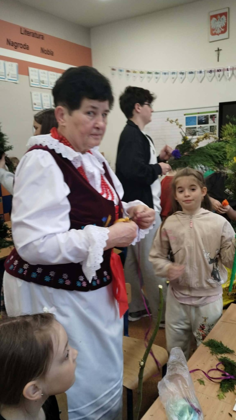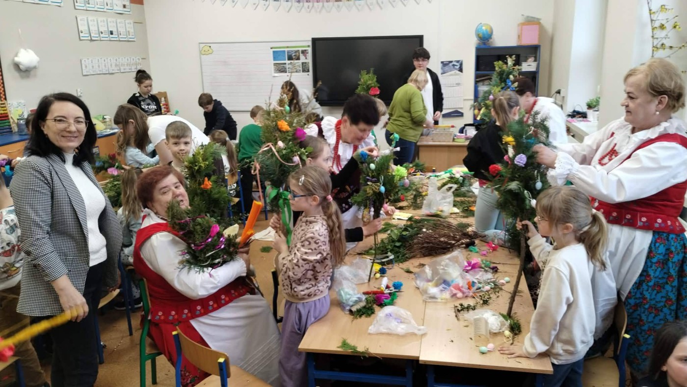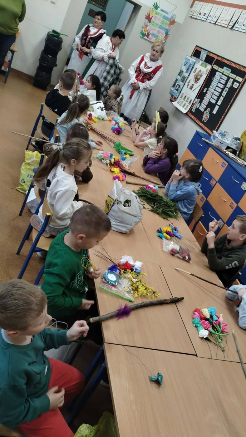 W dniu dzisiejszym w klasie I i II z okazji nadchodzących Świąt Wielkanocnych zorganizowano warsztaty wyrobu palm wielkanocnych. Celem zajęć było przybliżenie tradycji Świąt Wielkanocnych, doskonalenie umiejętności współpracy, rozwijanie poczucia estetyzmu i rozbudzanie wyobraźni. Poprowadziły je dla nas Panie z Koła Gospodyń Wiejskich,na które zawsze możemy liczyć . Podczas warsztatów każde dziecko wykonało tradycyjną palmę wielkanocną z bukszpanu, trzciny, gałązek oraz suszonych kwiatów. Na zajęciach panowała miła, radosna atmosfera. Wykonane na zajęciach palmy uczniowie zabrali ze sobą do poświęcenia w Niedzielę Palmową.