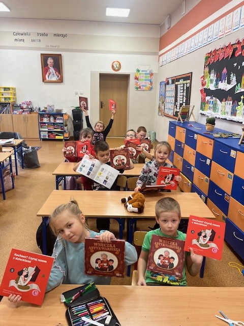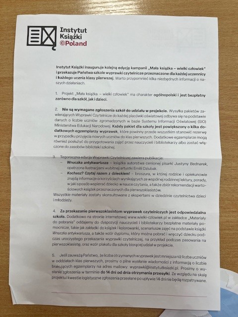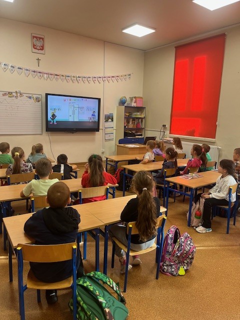 W klasie pierwszej odbyły się zajęcia biblioteczne w ramach ministerialnego programu „Wielka Książka – Mały Człowiek”. Zajęcia poprowadził nauczyciel bibliotekarz. Na początku uczniowie obejrzeli film edukacyjny pokazujący, jak powstaje książka – od pomysłu aż po druk. Następnie dzieci uczestniczyły w rozmowie o książkach i czytaniu, dzieląc się swoimi wrażeniami. Każdy uczeń otrzymał książkę w ramach wyprawki dla pierwszoklasisty. Dzieci miały okazję obejrzeć także książki Justyny Bednarek, w tym „Wnuczka Antykwariusza”. Na zakończenie zajęć uczniowie wykonali prace plastyczne przedstawiające siebie podczas czytania książki. Lekcja nie tylko wzbogaciła wiedzę o świecie literatury, ale także zachęciła najmłodszych do korzystania ze szkolnej biblioteki i rozwijania pasji czytelniczych.