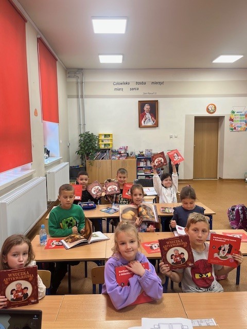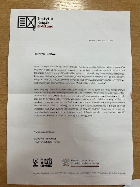 W klasie pierwszej odbyły się zajęcia biblioteczne w ramach ministerialnego programu „Wielka Książka – Mały Człowiek”. Zajęcia poprowadził nauczyciel bibliotekarz. Na początku uczniowie obejrzeli film edukacyjny pokazujący, jak powstaje książka – od pomysłu aż po druk. Następnie dzieci uczestniczyły w rozmowie o książkach i czytaniu, dzieląc się swoimi wrażeniami. Każdy uczeń otrzymał książkę w ramach wyprawki dla pierwszoklasisty. Dzieci miały okazję obejrzeć także książki Justyny Bednarek, w tym „Wnuczka Antykwariusza”. Na zakończenie zajęć uczniowie wykonali prace plastyczne przedstawiające siebie podczas czytania książki. Lekcja nie tylko wzbogaciła wiedzę o świecie literatury, ale także zachęciła najmłodszych do korzystania ze szkolnej biblioteki i rozwijania pasji czytelniczych.