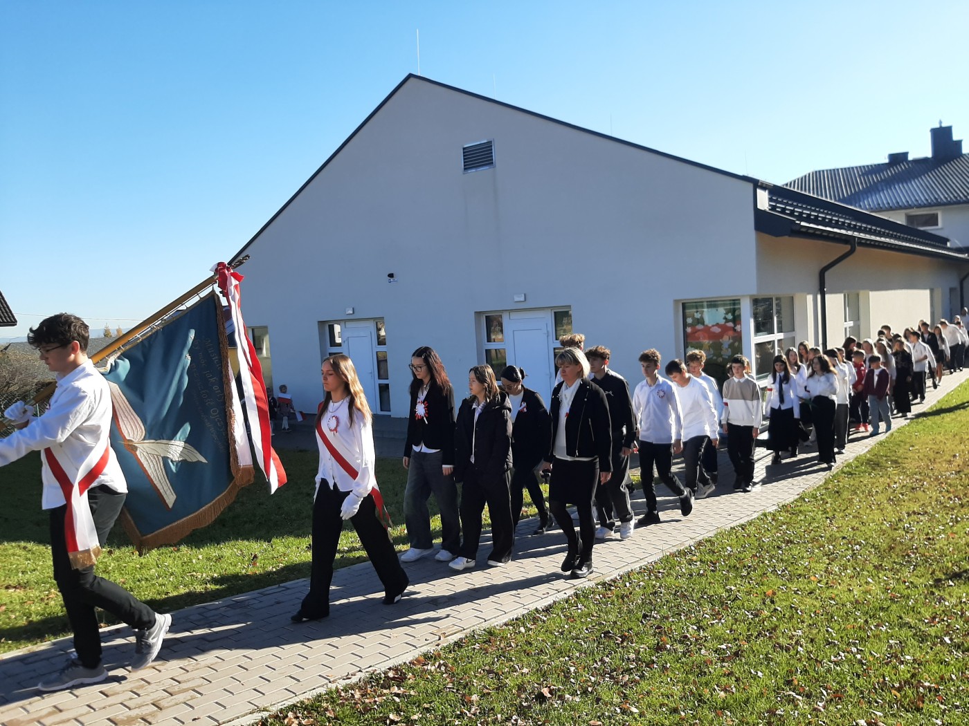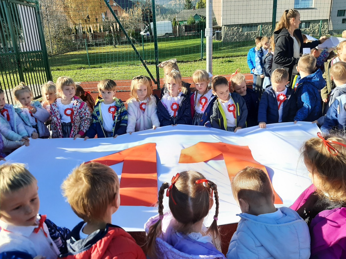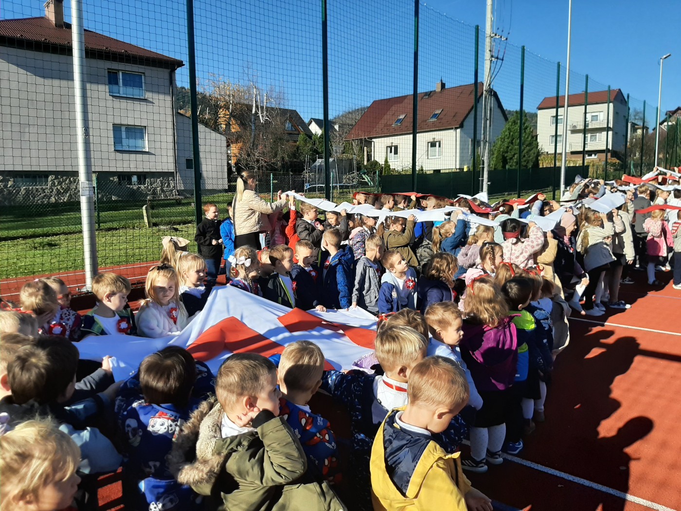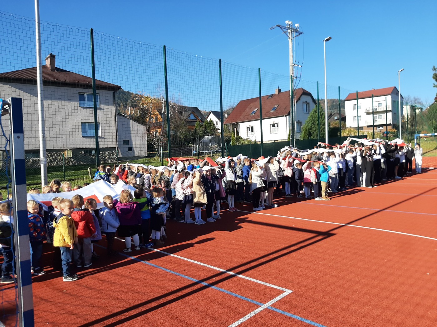 Uroczystość rozpoczęła się od wywieszenia polskiej flagi przez poczet flagowy. Nastepnie cała społeczność szkolno-przedszkolna przemaszerowała za pocztem sztandarowym na boisko szkolne, by o godzinie 11:11 wspólnie zaśpiewać „Mazurka Dąbrowskiego” w ramach ogólnopolskiej akcji „Szkoła do hymnu”. Następnie przedszkolaki i uczniowie ustawili się do pamiątkowego zdjęcia, tworząc napis „11 listopada” – symboliczny znak naszej jedności i patriotyzmu.