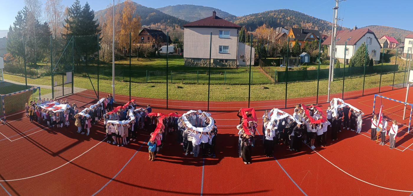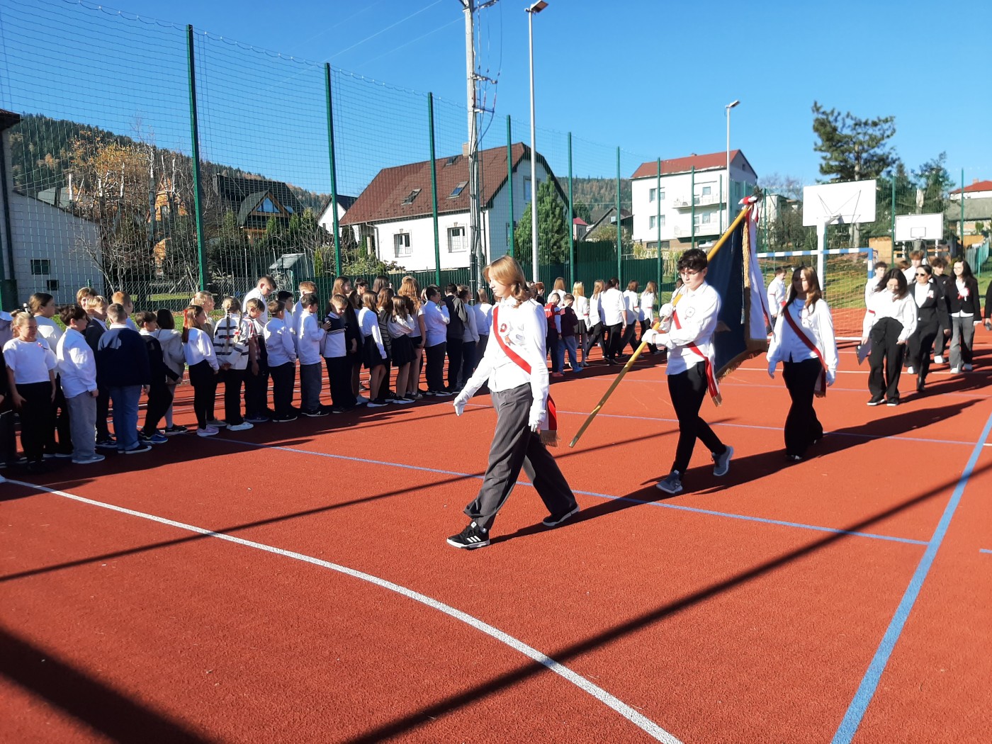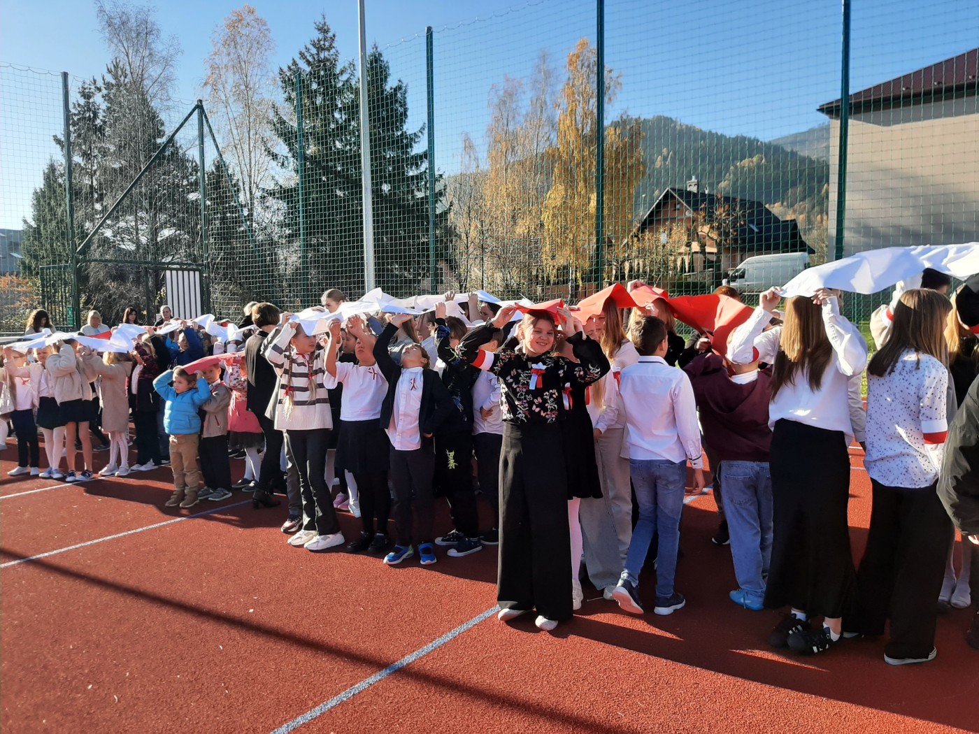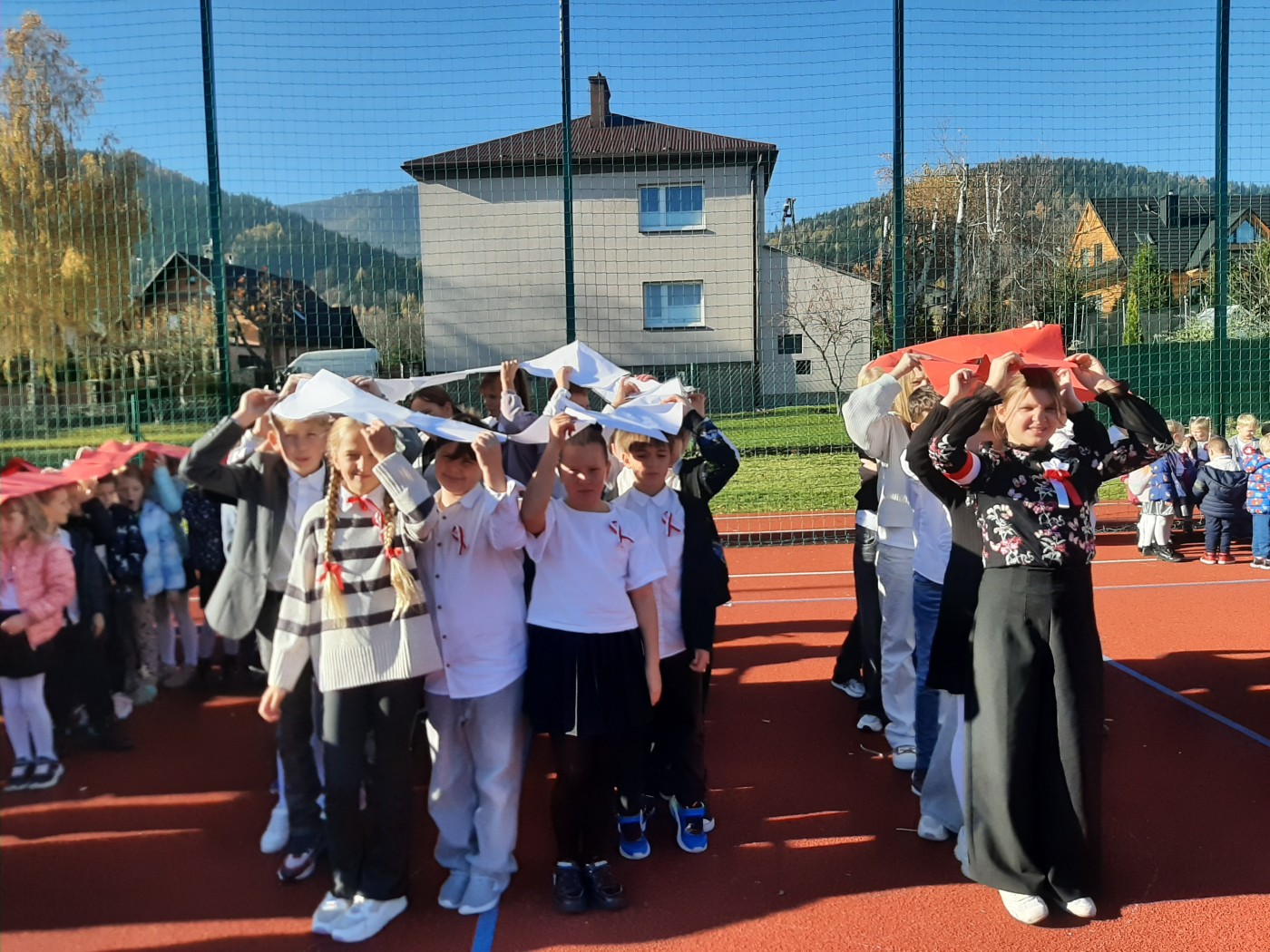 Uroczystość rozpoczęła się od wywieszenia polskiej flagi przez poczet flagowy. Nastepnie cała społeczność szkolno-przedszkolna przemaszerowała za pocztem sztandarowym na boisko szkolne, by o godzinie 11:11 wspólnie zaśpiewać „Mazurka Dąbrowskiego” w ramach ogólnopolskiej akcji „Szkoła do hymnu”. Następnie przedszkolaki i uczniowie ustawili się do pamiątkowego zdjęcia, tworząc napis „11 listopada” – symboliczny znak naszej jedności i patriotyzmu.