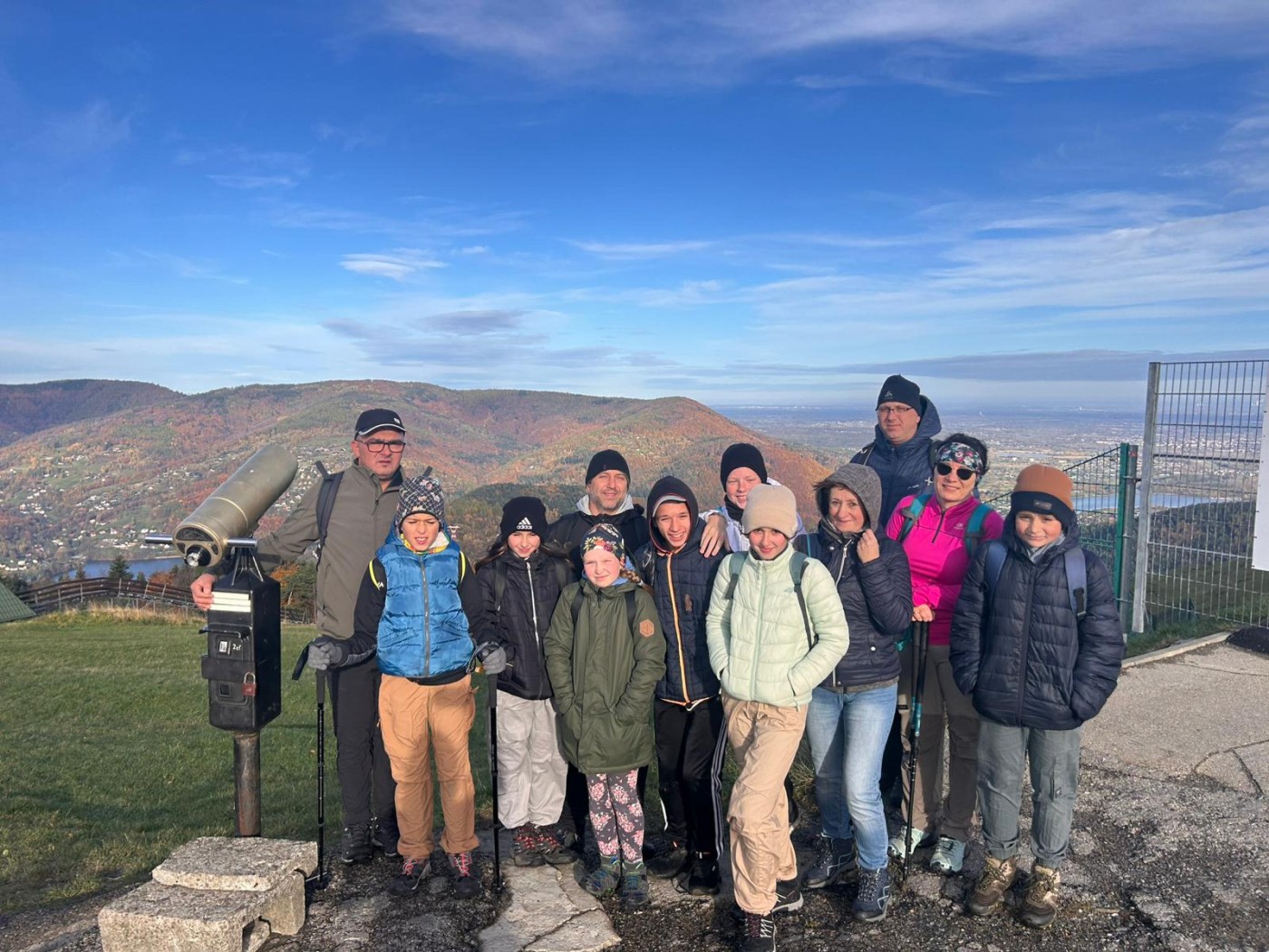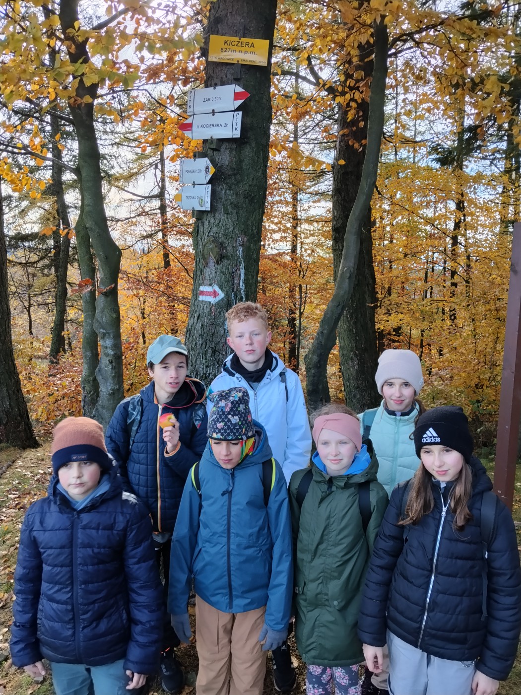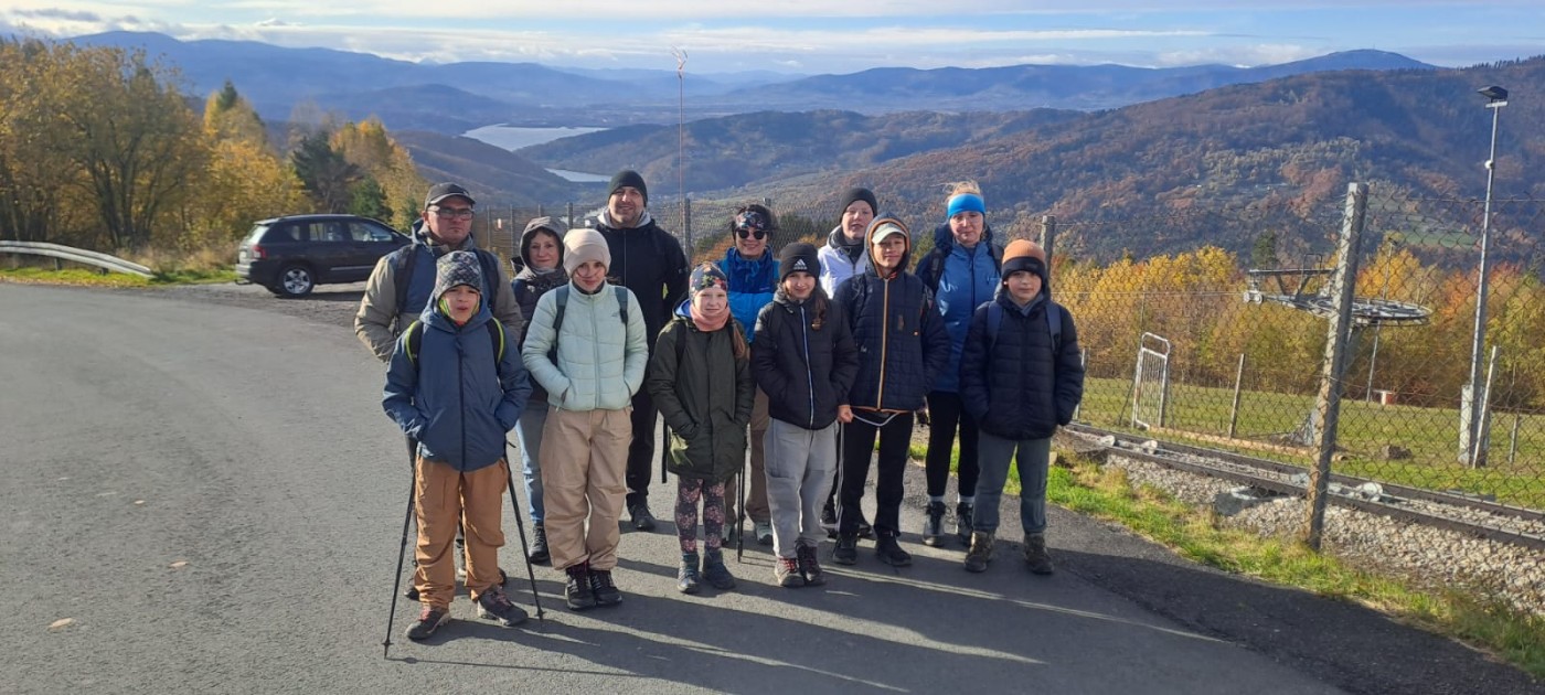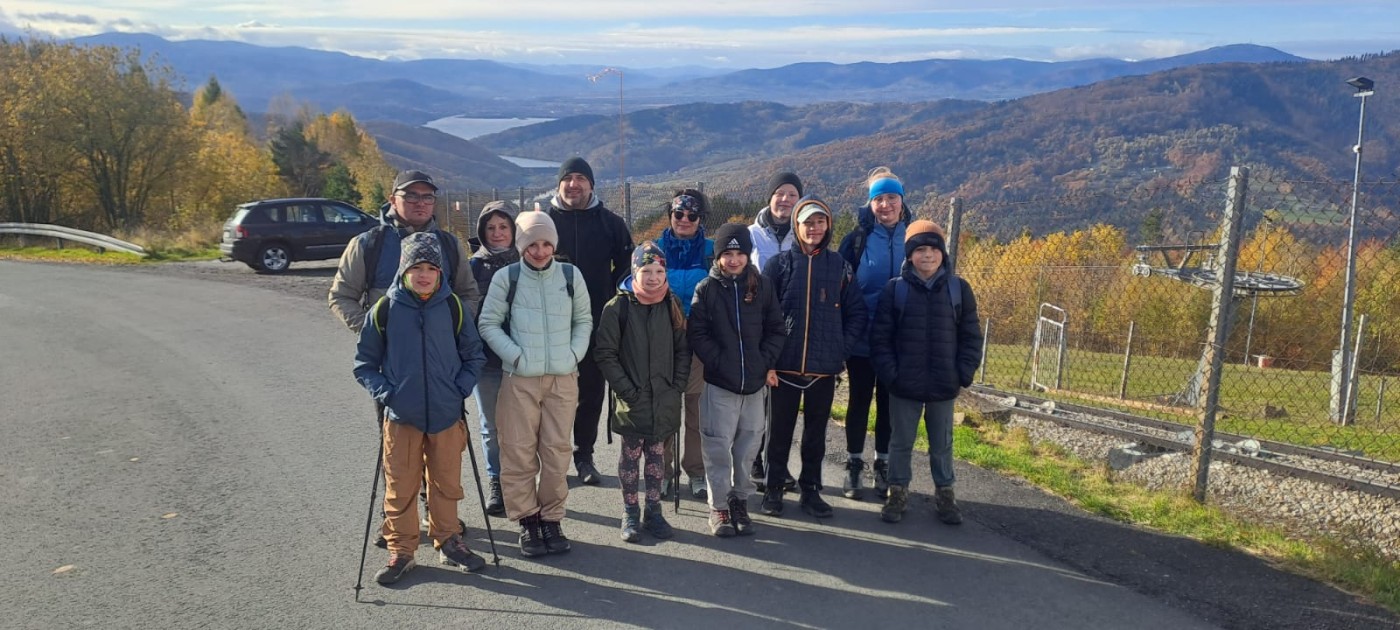 Po krótkim odpoczynku przy górnej stacji kolejki ruszyliśmy zielonym szlakiem w stronę Kiczery. Ten odcinek to już spokojniejsze wędrowanie — w większości leśna ścieżka, kilka krótszych podejść, trochę zejść. Po drodze mijaliśmy polanki z ładnymi widokami na Beskid Śląski Żywiecki. Sam szczyt Kiczery to przyjemne, spokojne miejsce — idealne na krótki postój.