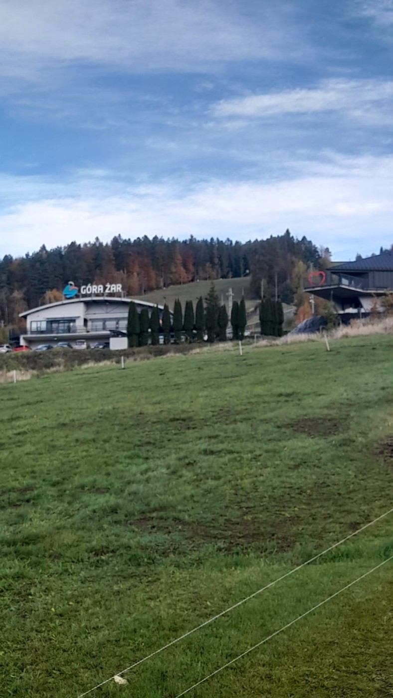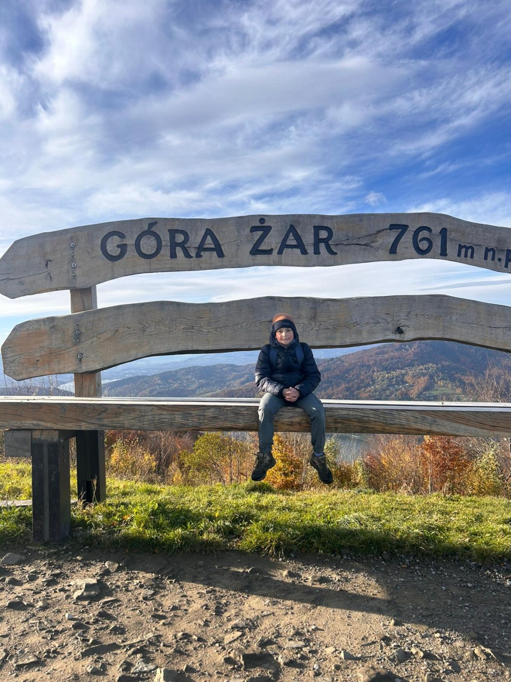 Wystartowaliśmy z Międzybrodzia, spod dolnej stacji kolejki na Żar. Już na początku czekało nas solidne podejście — idzie się wzdłuż torów kolejki, więc w zasadzie cały czas pod górę. Szlak nie jest długi, ale nachylenie potrafi dać w kość. Za to im wyżej, tym ładniejsze widoki, a na samej Górze Żar panorama jest po prostu genialna.